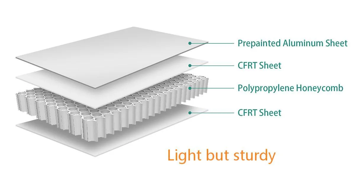 ●தேன்கூடு தீர்வு: மிக இலகுவானது. எங்கள் கலப்பு பேனல்கள் எஃகுக்கு சமமான அல்லது அதிக வலிமையை வழங்குகின்றன உடல் எடையை 30% முதல் 50% வரை குறைக்கும் போது.